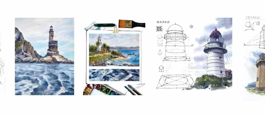 Маяки имеют разную форму, поэтому сначала мы изучим основных типы и научимся их простраивать с учетом линейной перспективы сделав очень красивые и живые скетчи, и постепенно перейдем к окружению маяков.